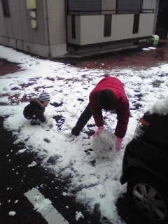 土曜日の朝窓を開けてビックリ。(゜ロ゜) ヒョオォォ! この冬 初めて雪が積もりました。 どーりで寒いわけやわぁ~とひとり ゾゾゾーっ~(>_<。)ブルッ としていたらひとりあげあげなお方が。元気な幼稚園児 もち子。 「よっちゃぁぁぁんっ やったぁ~! 雪合戦できるねぇ~!O(≧∇≦)O 」 う・・・うん・・・。パパが起きたらお外に連れてってもらいな~。(丸投げ) て事で午前中はパパと雪遊び。 パパはホントはお仕事でしたが生徒さんも自転車で来ると危ないと判断し土曜特訓を延期し急遽お休みとなったのデス。 土曜日にパパと遊べるなんて滅多に無いこと。ちゅうか 初めて?か? ホントに楽しそうに遊んでました。雪だるまを作ったり投げ合いっこしたり。 「寒いでもう中に入る・・・」ってすぐに言いだすかと思ったけど結構長い時間遊んでました。だって 雪が積もるの楽しみにしとったもんね。良かったね。もっち。 パパもお疲れ様でした。ありがとう。 また降るといいなぁと思ってるのは もっちだけやね(^_^;)