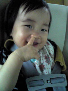車に乗る時助手席にもっちが乗るので後部座席にはチャイルドシートに座るさこひとり。 眠い時はぐずりまくりチャイルドシートに縛られてる状態で足をバタバタ首をブンブン振って大暴れする。 機嫌の良い時はたま~に フフッっと笑い声が聞こえる。 後ろを振り向くとにんまり笑顔・・・で、指を鼻の穴にスッポリ入れている・・・。 「こら!さこ!やめなさい!!」と言うと更ににんまり笑ってもっと奥へ突っ込み その後 その指を今度は口に入れる(T_T) レディーがそんな事しちゃダメよ!と言いながらもあまりにも幸せそうな笑顔だったので写真を撮ってしまうバカな私。 ついでにもっちにも同じ事をさせてみた。 違うよもっちもっと笑顔で! と言おうとしたけどやめた。 こんなバカげた事を3人でやっている時が結構幸せだったりする。