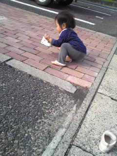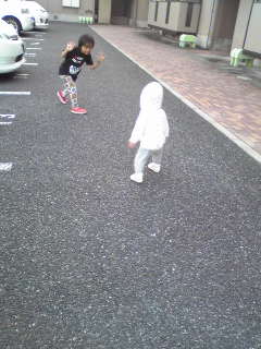 さこと同じ歳のお友達がお風呂で数を数えるというのをブログで読んでからうちもお風呂で数を数えるようにしてみた。 もっちがかわいい声で数えてくれる。「い~ち に~ さ~ん し~・・・」 さこは・・・最初の頃はニコニコしてるだけだったがこの頃は声に出して一緒に数えるようになった。そしてやはりお友達のくぅちゃん(仮名)と同じく「い~ちっ い~ちっ い~ちっ・・・」と「イチ」ばかり。お前もか(笑) 思うに 1 も 7 も 8 も○チ やもんね。そのせいかと。 10を数え終わると必ず人差し指をほっぺにつけて「かいっ? かいっ?」と言う。これはさこの 「もう1回」なので3度程繰り返す。 こっちの言っている事もたくさん理解しているしさこの言いたい事もどんどん増えてきた。 最近は 「てっ!」これは 「見て。」って事。すべり台にひとりで上ったよ。 「てっ!」テレビでたまごっちがやってるよ。 「てっ!」靴下脱いだよ。 「てっ!」 「てっ!」と言われた時は「ホントやね。すごいね。」と言ってやると、満足そうな顔をする。 そして今日初めて外に出る時に私もかばんを持ちたいの 的な動きを見せてきた。 おお!またもやお前もか(笑)「かばん?持ちたいの?」と聞くと「うん。」とハッキリお返事が返ってきた。 さこ用のカバンなんて無いので私の持ってる小さめのバッグを持たせてあげたらそれを持って先にスタスタ歩きだした。小さめのバッグと言ってもさこが更にちっちゃいのでそのバッグを地面にひきずりながら(T_T)お~いまぁ 本人楽しそうやし女の子って感じがして私も楽しい。 やっぱ女の子って違うなぁ・・・と思っていたらなぜか急に座り込み靴を脱ぎ 更に靴下を脱ぎなんと裸足で歩きだした。 きたないとか あぶないとか ケガするよ とか言おうと思ったけどなんとなく裸足で歩くのもたまにはいいかもねと見守ってみた。なんか面白かったし。写真も撮ってみたりして。↓ まぁ こんくらい元気になったよって事で良しとするか。 ちなみに裸足の散歩は3分持たなかった。やっぱ痛かったらしい(笑)