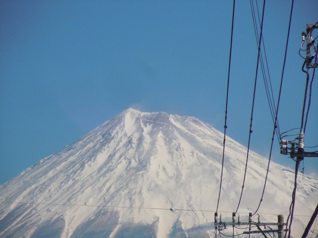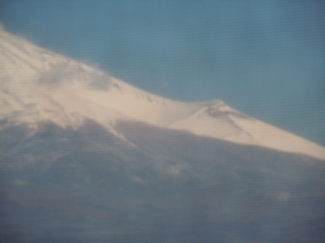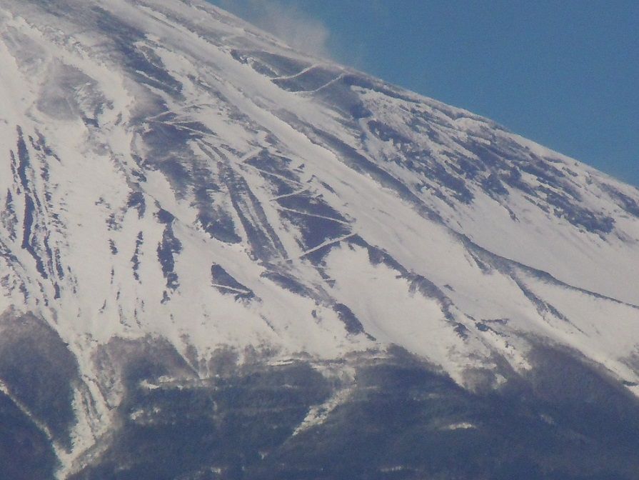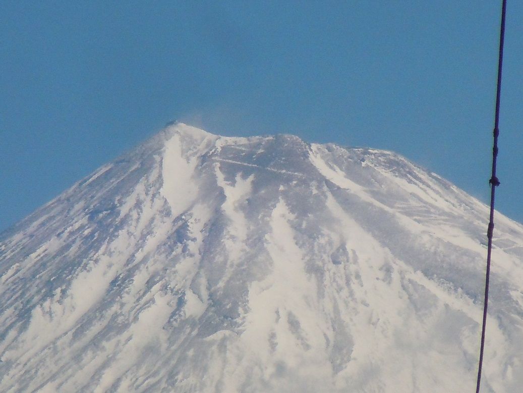 今日の富士山の山頂です(積雪が山肌に薄く積もってベールのようです)(このベールは風と熱ですぐにはがされてしまいます)