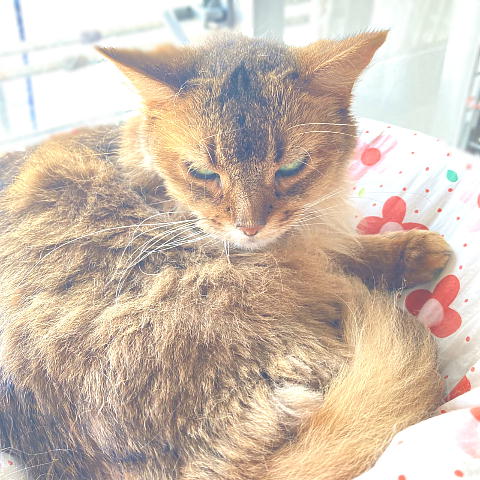 「さき」が朝日の日光浴してるけど、今日は曇り空だね~。。暑い日が続いたから、これぐらいがちょうどいいって感じてる?さすがにエアコンが入ってるから室内は暑くないよ~。優しい日差しが有難い年齢になってるよね(^_^;A