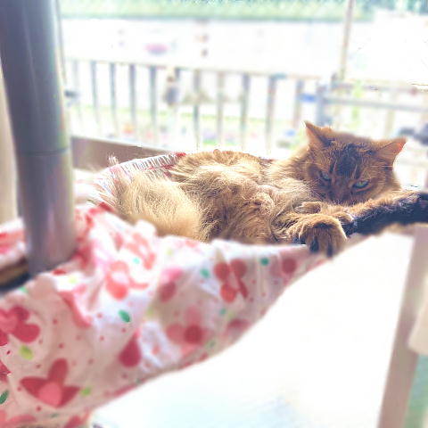 「さき」の朝食タイム♪うまうま♪シャッター音で顔をあげたら、みごとなワル顔や(笑)食後は、いつもはハンモックで日向ぼっこだけどこの日は朝から直射日光が差し込んでいてそこは暑すぎるのか、さけて猫かごへこちらでクールダウンするみたいです(≧ε≦o)