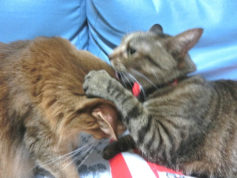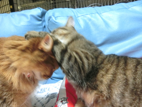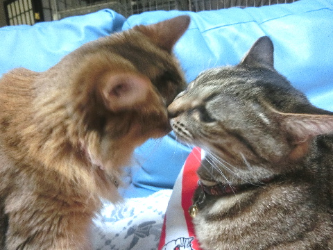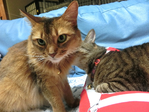「ゆき」に寄って行って、無理矢理毛繕いする「さき」です。