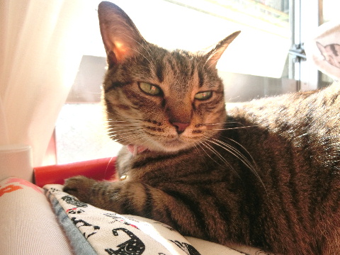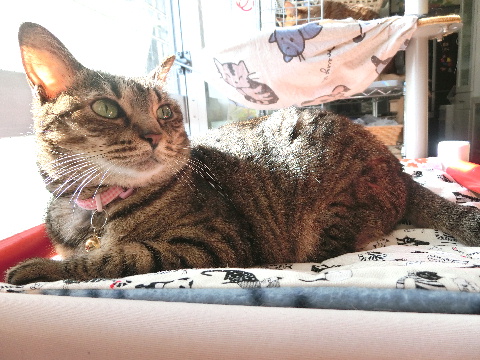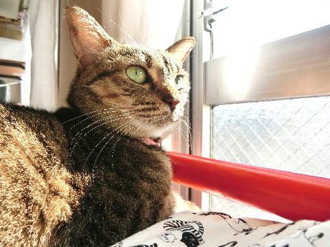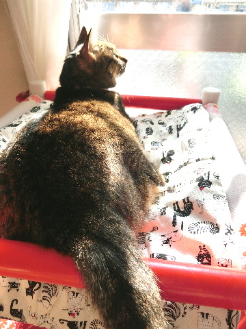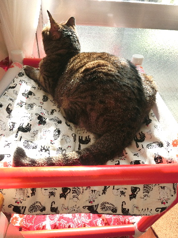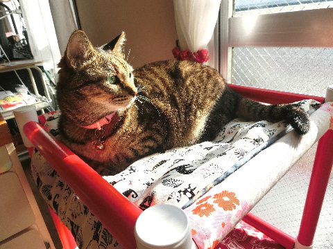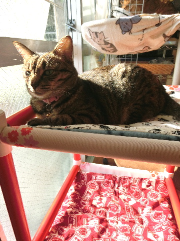 「ゆき」が朝日の当たる場所で3段モックで日光浴♪