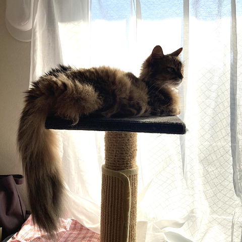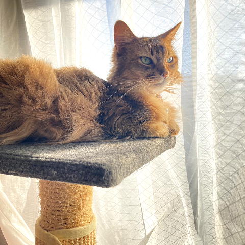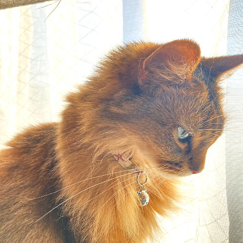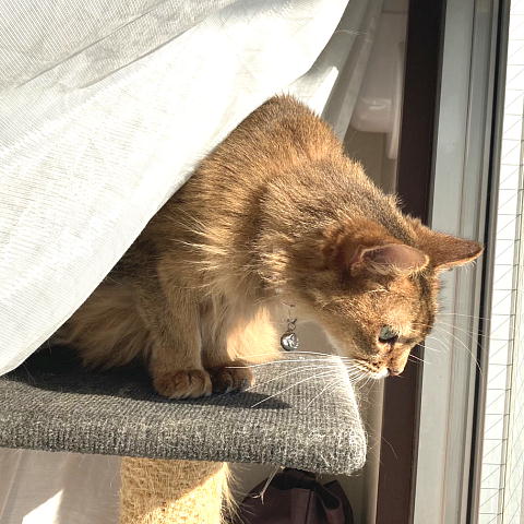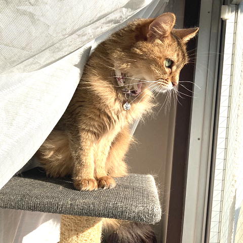 「さき」がレースのカーテン越しに日向ぼっこ中。