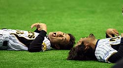 ウオーミングアップでじゃれ合う赤星(左)と下柳。ともに第3クールのこの日からステップアップだ