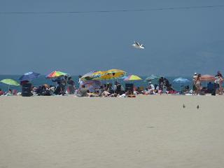 今の時間はロサンゼルスでは6月23日22時ですが、日本では6月24日14時です。でも、自分にとっては日本時間で6月23日の38時になります。1日40時間・・・寝てないので眠いです。ところで、今日はロサンゼルスの市内観光をしました。市内観光と言ってもロサンゼルス市近郊のベニス市やサンタモニカ市、ビバリーヒルズ市など回りました。歌でしか知らないサンタモニカですが・・・そのサンタモニカのビーチです。平日だというのにかなりの人がいました。ハリウッドのチャイナシアターでも人出が多かったです。テレビ局がたくさん来ていました。何かイベントがあるようです。写真は有名なハリウッドのサインで、この山の向こうにユニバーサルスタジオなどの撮影場所があるようです。ファーマーズ・マーケットで食事をしましたが、マーケットの果物がやすかったです。さくらんぼは1パック99セント、マンゴーもそのくらいから売っています。広場の一角にレールらしきものがありました。日本でもよくある線路の跡かなと思ったいたら、オープントップの2階建ての路面電車がレールの敷いてある歩道を走っていきました。本物の線路とは思いませんでした。