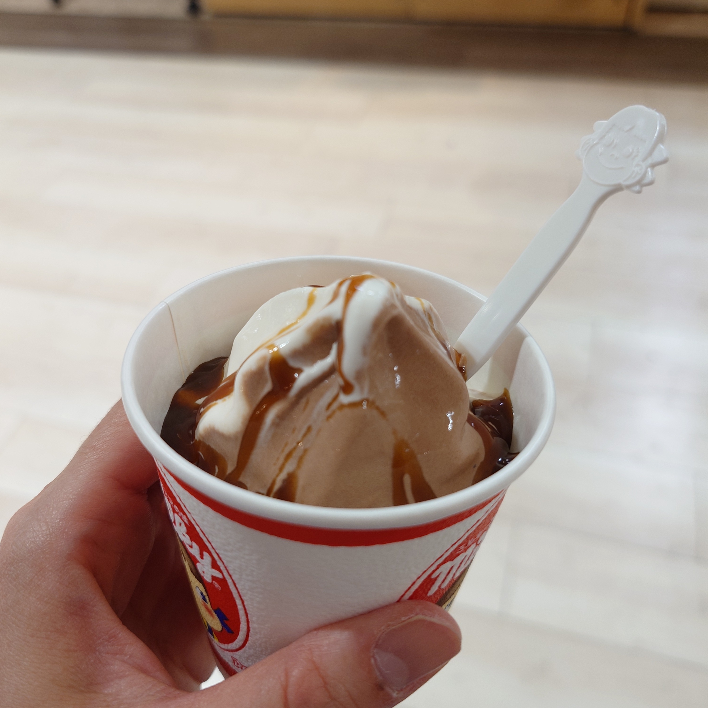 ラピアにオープンして10年余り、何度も気になっては近くまで行くも結局素通り😅最近はファンタジードームの17アイスばかり食べていて、たまには違うアイスを食べたいなぁと思い、そういえば不二家にアイスあるじゃん!と思い遂に行ってみました!水晶堂の前のベンチを借りて初不二家を堪能😋私は、「ミックス(キャラメルソース)」ミルクの濃厚さが感じられ、チョコレートは甘すぎず美味しかったです✨意外とキャラメルソースがいいアクセントになってました😆旦那は、「ミックス(チョコレートソース)」娘は、「ミルキー(ストロベリーソース)」量が多いから娘は残すと思いましたが、途中まで食べて帰りの車の中で完食😳👏美味しそうなケーキもたくさんあったから今度買ってみようかな☺️にほんブログ村