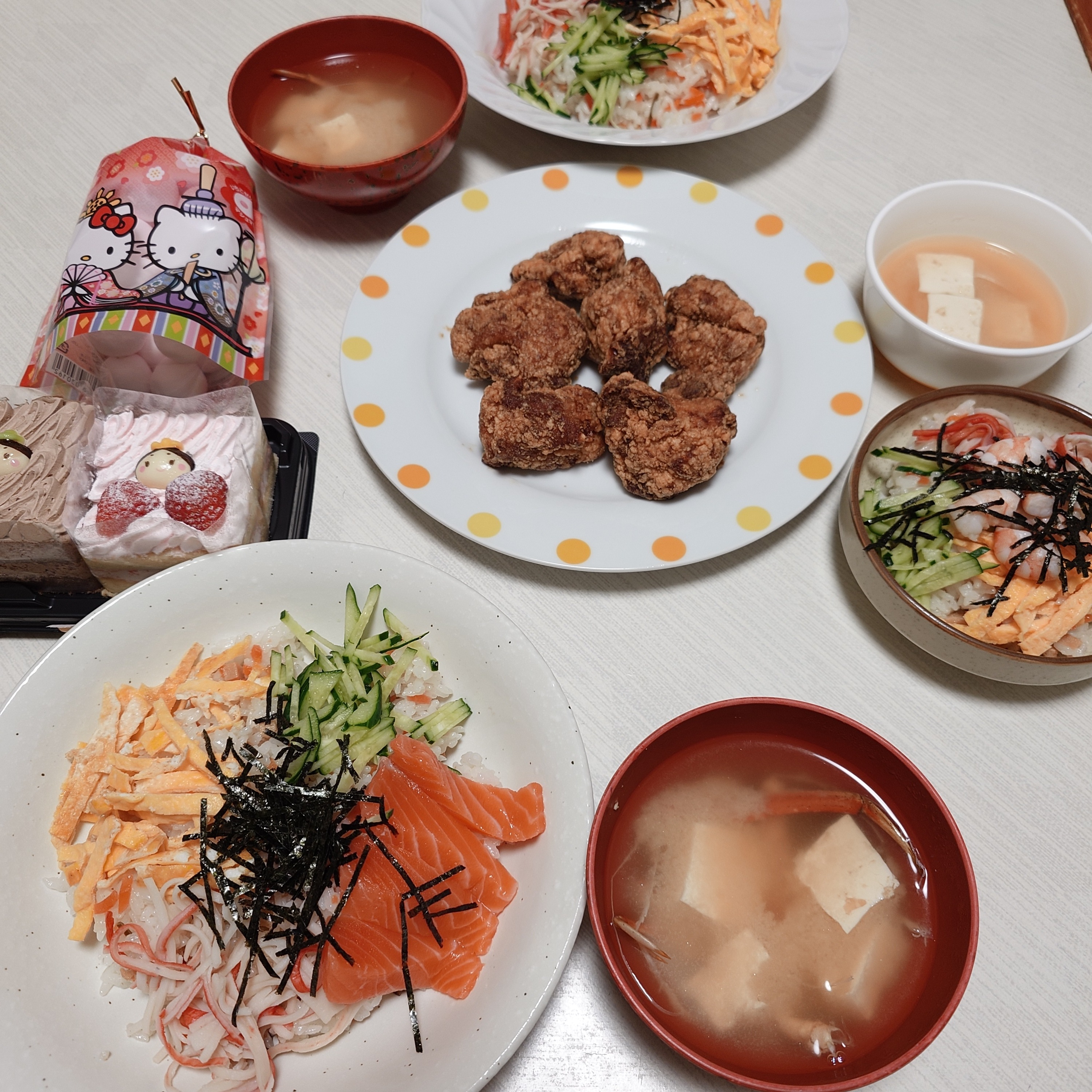 日付変わっちゃいましたが…昨日は我が家でひなまつりパーティーをしました🎎🍡🌸…と言っても大したものを用意していないのでパーティーとも言えませんが😅ちらし寿司、かにの味噌汁、冷凍食品の唐揚げ、ケーキ、マシュマロ。ふるさと納税で頼んだ蟹。足だけ残して冷凍していたので味噌汁にしてみました。結果身が入って無さすぎて蟹の存在感なし😂😂😂大人のちらし寿司はサーモン入り、子供は茹でたエビ。キティちゃんのマシュマロは毎年恒例😊ひなまつりケーキは色々あった中からこれが可愛かったので😆(実はこれだけ割引シールが貼られてたなんて言えない…🤣)にほんブログ村