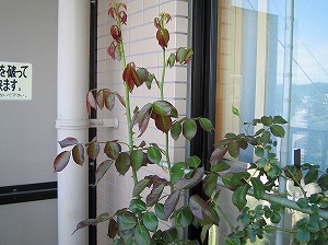 ピエールのシュートが伸びてきました。今年は結局、春は数輪しか咲かず、今ごろポツポツ咲いています。でも私の好きな柔らかな表情のピエールではなくて、なんと言うか、とがった感じなのです。ベランダ奥で直射日光が当たらないので、少しでも明るくなればと銀色の紙を窓に貼り付けていますが、効果あるでしょうか??