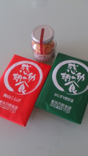 軽井沢倶楽部 ホテル軽井沢1130先日の軽井沢から、もう10日も経っているんですね。私が利用したのは、楽天トラベルではありませんが、こちらもリーズナブルなお値段からちょこっと贅沢なお値段まであります。もう一度行きたい宿というのが、いくつかあります。ここもその仲間入りが出来そうで嬉しい。静かで、広々していてゆったりしていますよ。そして…お土産に買った品々があまりに美味しくて、お取り寄せしてしまいました。特にお気に入りは、この「感動の朝食」というシリーズです。野沢菜、梅山くらげ…あといくつかあったのですが、朝ご飯にぴったり!おにぎりにしたら、家族が大喜びでした。お土産って、食べきれなかったり、時々期待しすぎて残念な感じだったりそういう経験が多かったので、“試しに”買ってみよう一個だけ。なんて思ったら、うわ~美味しい。しかも、ホテルの名前で出してるオリジナルなんですね。なので、ホテルに直にお取り寄せしないと食べられない(笑)手に入らないっていうより、「食べられないじゃない、食べたい」っていう感想。一緒に写っているのは、ヨーグルトに混ぜるドライフルーツ。これは綺麗で可愛い。味もシンプルなので、ヨーグルトの酸味と合いますよ♪感動の朝食、8個も取り寄せしてる自分に感動。素敵な宿で、美味しいものに出会うって幸せですから♪