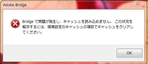 Bridge で問題が発生し、キャッシュを読み込めません。この状況を解決するには、環境設定のキャッシュ項目でキャッシュをクリアしてください。以下の手順にて対処、解決しました。Adobe Bridgeを通常通り開いて 「編集/環境設定」 「キャッシュ」をクリック キャッシュを削除《参考》http://helpx.adobe.com/jp/creative-suite/kb/230976.html#main_anc_b