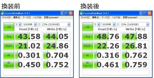 起動時間は変化ありませんでしたがこの結果から見ると、メモリのアップグレードによって若干ではありますがHDDのパフォーマンスが上がったように思えます。