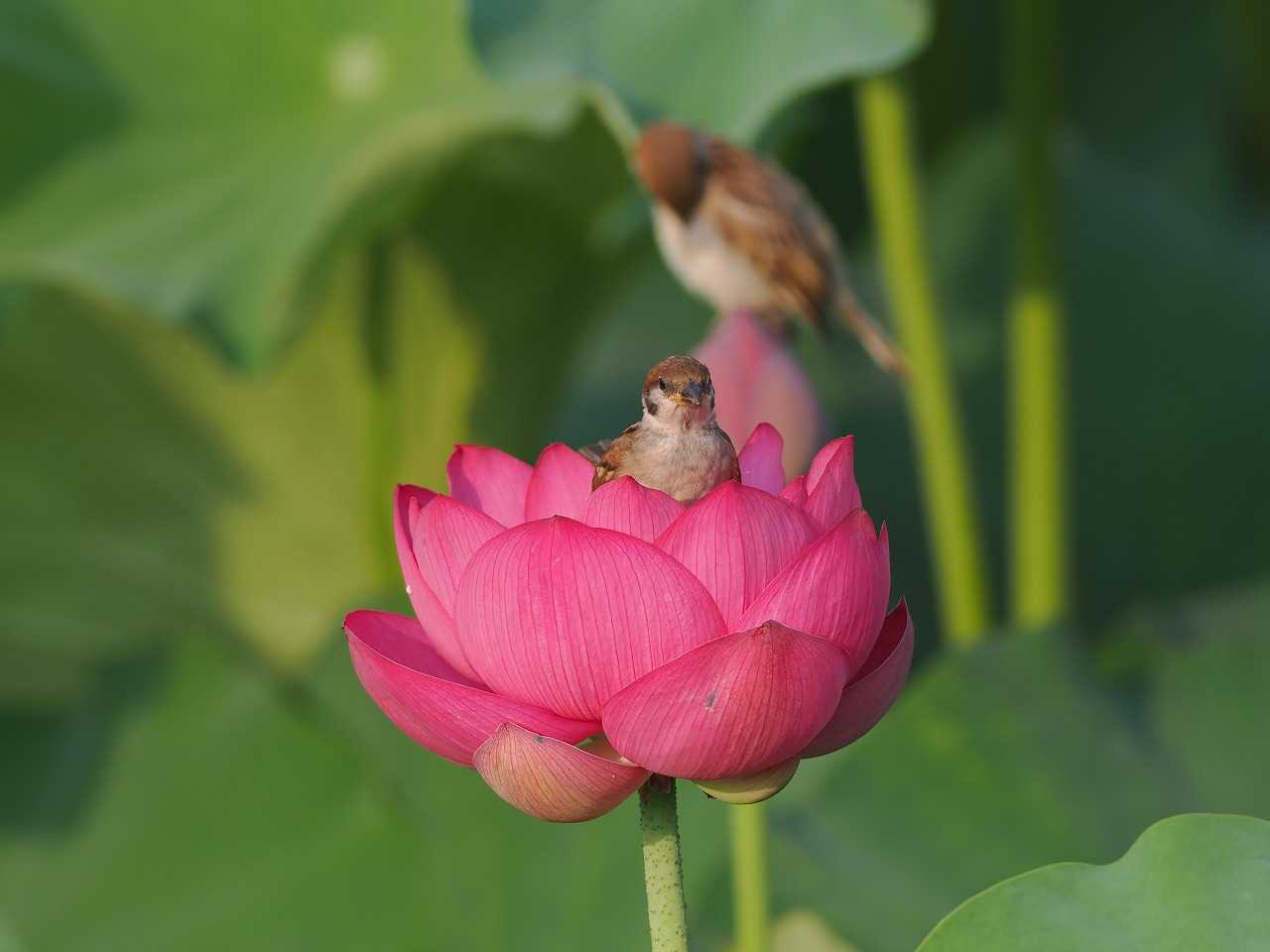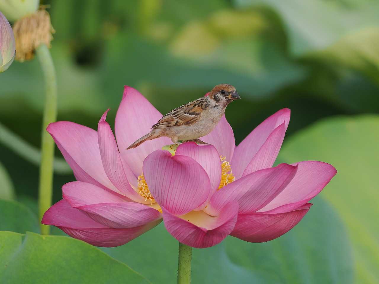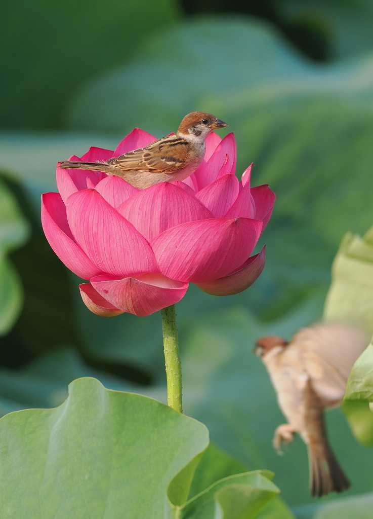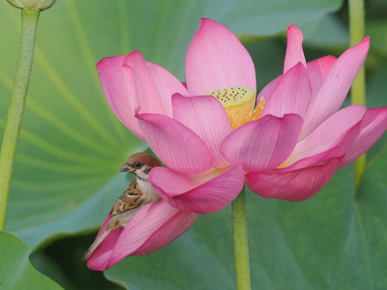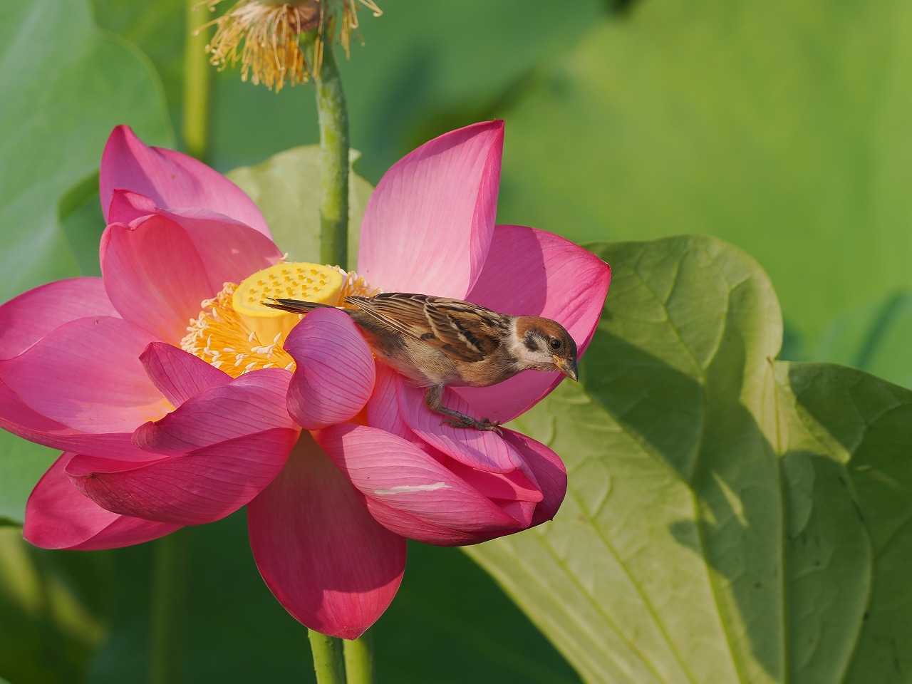 ハスの花にスズメが絡んでくれました June 28, 2025