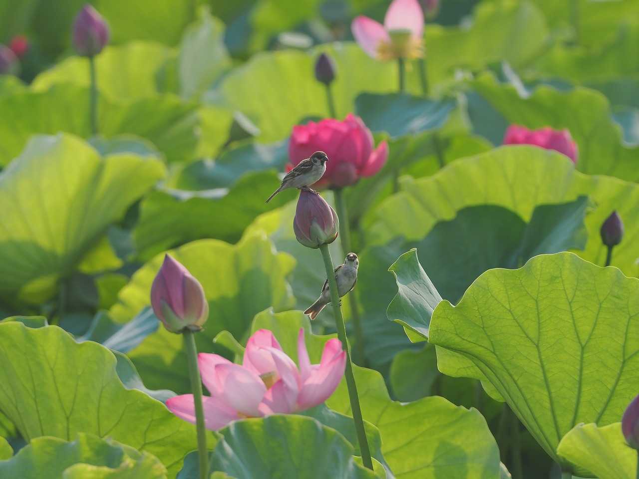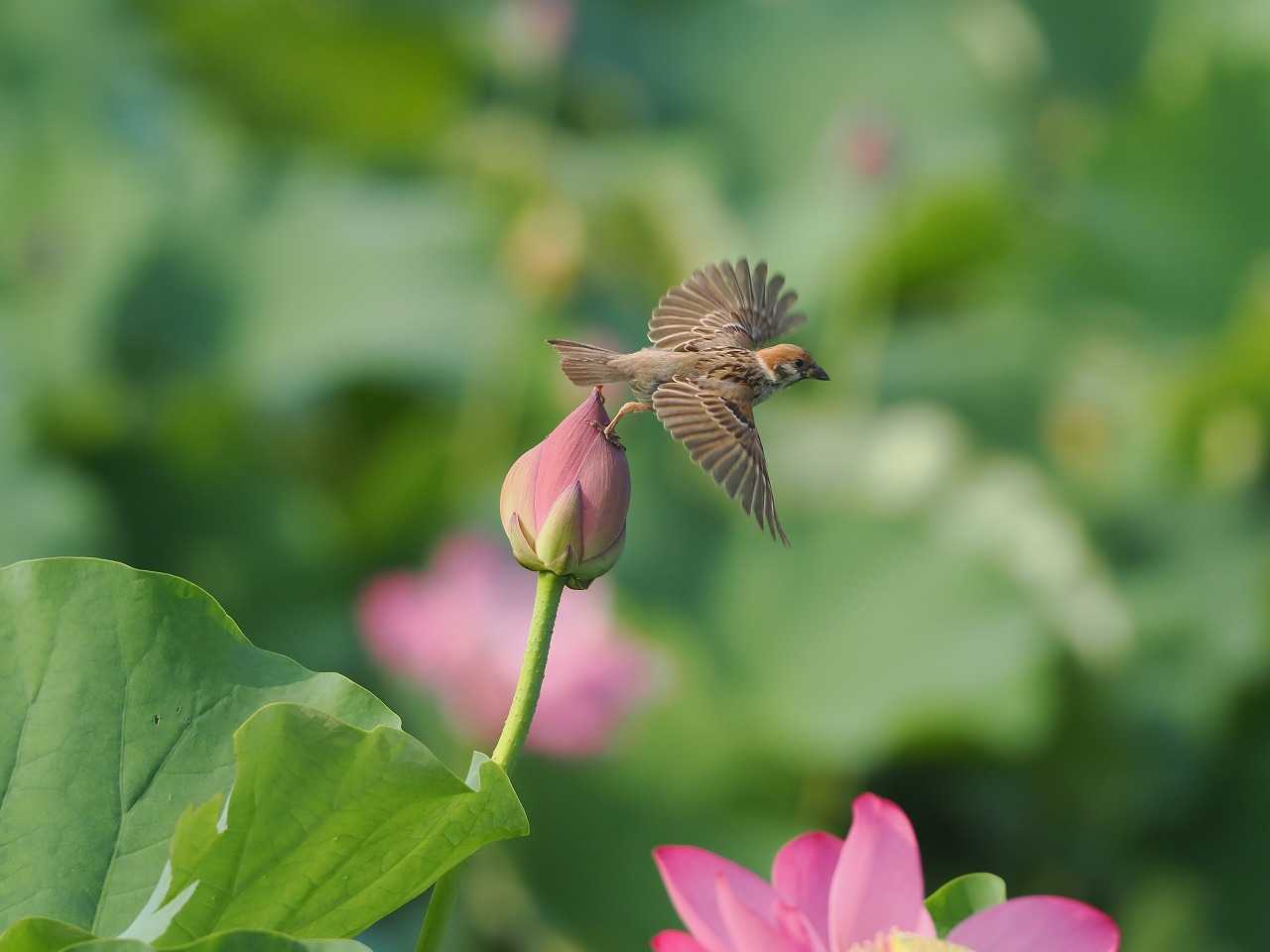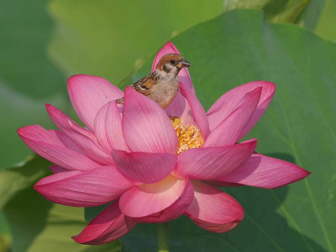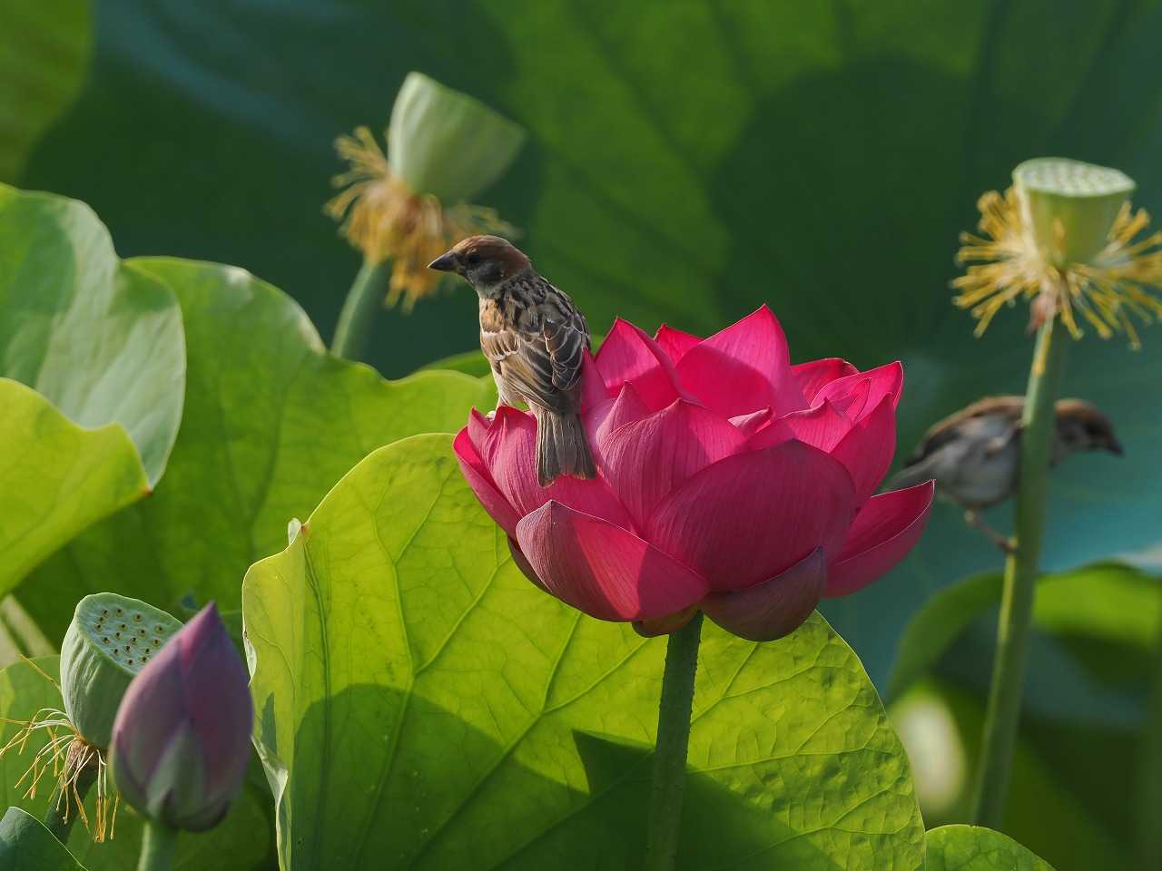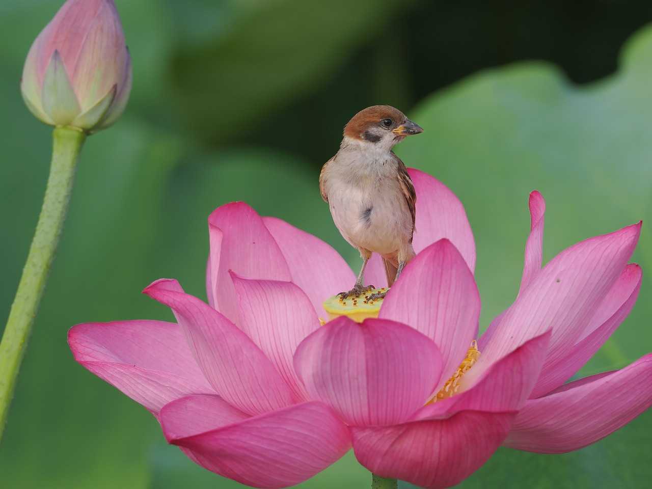 ハスの花にスズメが絡んでくれました June 28, 2025