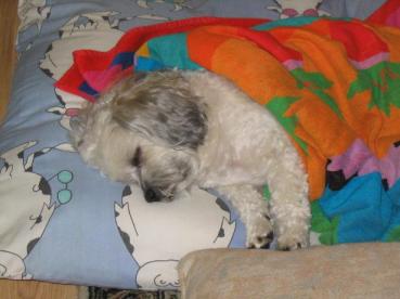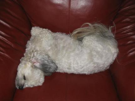 今朝、我が家では事件発生~!な、なんとマフィンが私のマグカップに顔を突っ込んでコーヒー飲んでました。ちょ、ちょっと~いくら人間の物好きだからってコーヒー飲まないで~。ちゃんとママ、マフィン用のお水いつも用意してあるじゃん。私がリモコンを探すのに床にマグカップ置いたのが悪かったんだけど、まさかマフィンが飲むとは思ってもみなかったよぉ..........。マフィン、一応あなたワンコですからカフェインは身体に悪いでしょ。ママ、いっぺんに眠気が吹っ飛んだわ~! 嫌いな長ーいお散歩に2日連続で連れてかれ、ボクもう駄目~。