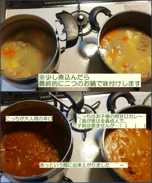 大人用と子供用(甘口)2種類のカレーを作ります。