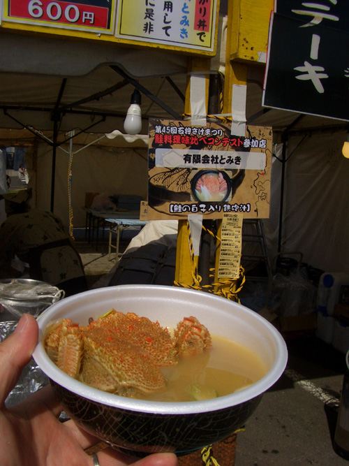 さけまつり会場に出店している事業者の中から5店舗がそのコンテストにエントリーし、来場者の食べ歩きによる人気投票が行われ、さらに三国清三シェフも審査員として審査した結果、「 有限会社とみき 」の『鮭の白子入り鉄砲汁』が最優秀に輝きました。
