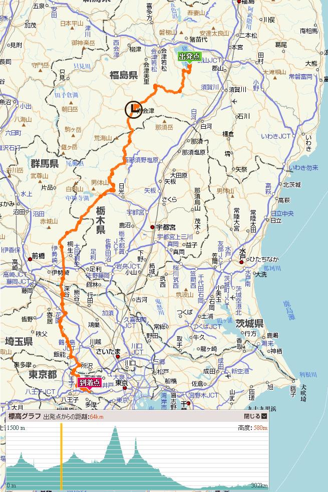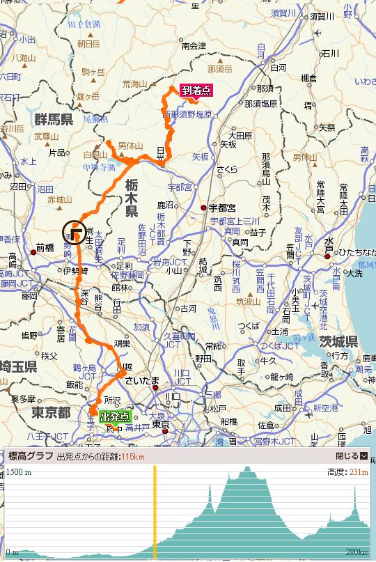 起床(5:00)→舟津浜発(6:20)→湖南→県235→国118→県347→湯野上温泉(休憩 7:40)→国121→下郷(給油 8:00)→田島→道の駅たじま(休憩)→国121→県23→川治ダム→県169→大笹牧場→霧降高原道路→県247→国120→日光 東照宮前(休憩 11:00)→国122→足尾→草木ダム(休憩)→大間々(休憩 12:40)→県69→県14→深谷→国17→県69→県11→小川→県30→越生バイパス→飯能→(15:15)→国463→入間(休憩 15:25)→県8→国16→都166→瑞穂→新青梅街道→都59→旧奥多摩街道→東京基地着(17:10)