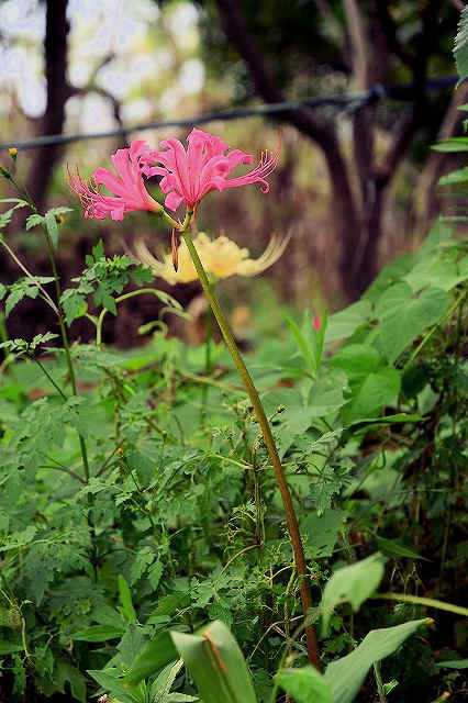 「彼岸花はまだかい」と散歩する、同じ仲間のピンク色のリコリスと、バックに黄色のもの、ピンク色か~、真っ赤な彼岸花と違う、また、何日か経ったら見に来ようと思っている。にほんブログ村散歩・ウォーキングランキング