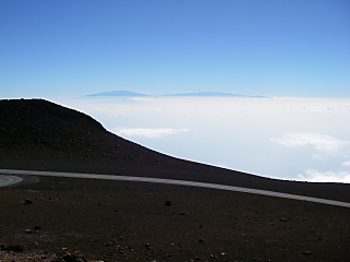 写真は、ハレアカラ火山の山頂から見た、隣のハワイ島にある、マウナケア、マウナロアの両山です。