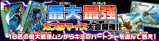 ムシキングホームページにて発表されていました。以下抜粋です。『最大最強カスタマイズ大会』大会ルール変更のお詫びとお知らせ1月7日(水)1月5日(月)のニュースにて告知の『最大最強カスタマイズ大会』のルールの一部に記載間違いがありましたため、内容を修正させていただきました。ご参加にむけてご準備されていた皆様には混乱をまねいてしまいましたことをお詫び申し上げます。大会は、1匹vs1匹で行いますのでお間違えのないようお願い申し上げます。情報をご覧になられたユーザーの皆様にご迷惑をおかけいたしましたことを心よりお詫び申し上げます。 今後は掲載内容に関し、より一層の注意をはらい公式サイトを運営していく所存でございます。 誤:【決勝】予選を勝ち上がった8名で2匹VS2匹かちぬき対戦をトーナメント形式で行います。 正:【決勝】予選を勝ち上がった8名で1匹VS1匹かちぬき対戦をトーナメント形式で行います。これならどの虫もノーガードで熱いバトルができますね♪間違いならよいのですが(笑)
