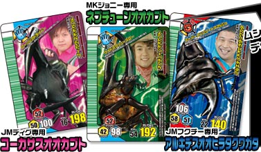 現行ムシキングの大会が終了しましたね。私は昨日も残業で参戦することができませんでした。大会参加された方はムシキングの醍醐味を再認識された方も多いようです。今までありがとうムシキング!いよいよ今月末新生ムシキングがスタートしますね。ホームページをみると以前公開されたカードから大幅に変更されています。洗練され、集めたくなるデザインになりましたね!!頑張っています!ムシキングチーム!!レアリティーは随分変わりましたね、ギラファがノーマル扱い・・・淋しい・・・アトラスはスーパー技装着状態の為、スーパーレアなのかな?オオクワは普通のタツマキですね~体力200、ぼうぎょ84でスーパータツマキつけたら結構戦えそうですね!!そしてムシキングオールスターズ限定カード!!カッコイイですね~アルキはスーパーコンプリートスマッシュ?ネプチューンもパワーアップしていて楽しみですね~ん?コーカサスはあまり変化がありませんね、なんで?ジョニーが自分で大阪まで運転しながら行脚するようです、会場でマスターズから貰えるそうなので是非ゲットしたいですね。道中事故の無いように気を付けて欲しいです。彼はメタボリックアーマー無さそうですから(笑)フクチーが日記で初心者の子も楽しめる大会を企画中と書いていました。そういった子供達からGC王のようなプレイヤーが生まれるといいですね。でも大人大会も残して欲しい・・・ここからは勝手な御願いです・・・・特殊技がなくなってしまいましたが、昆虫ダッシュのムシ達をお助け虫として登場させたら楽しくなるかな~とオケラが穴を掘って攻撃できなくしてしまうとか、オニヤンマが空中戦になると助けてくれたり。ゲームの幅が広がると思うのですが。