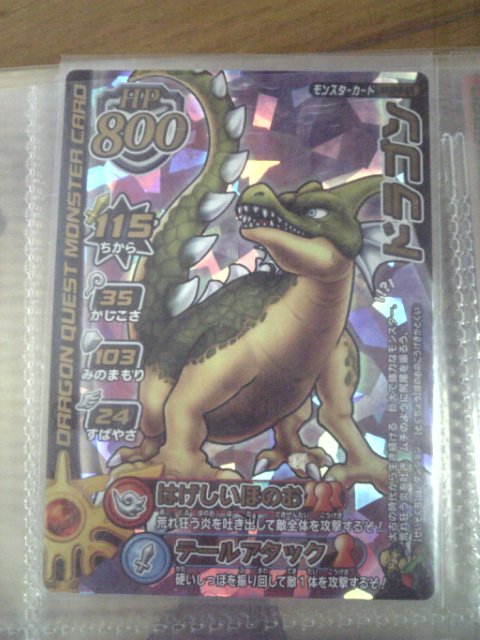 今日はムシ、恐竜と参戦しましたが全て一回戦か二回戦で負けです。恐竜では新しいサウロファガナクス試しました。超~に期待したんですが水が多いこの時期に超わざをからませるのは恐いですね。さて夕方のドラクエペアですが参加8組に対して希望41組です。どの地区でも参加するのはすごい大変みたいですね。家はゆうき、ユマヨマペアが名前呼ばれました!お友達のNMT会長様も呼ばれ参戦決定です。残念ながらゆうきペアは一回戦で敗退しましたが、排出されたカードが黒い~~~ゆうきがゆっくり裏返すとなんとドラゴン!!3章はほとんどレンコらしいレンコもしてなかったんですが、ここでまさか出るとは…負けて良かったかも?たしか、以前もよしきが始まったばかりのドラクエ大会で負けた時の排出カードが「ぱふぱふ」だったことを思い出しました。会長様ペアも「暗黒の魔人」と「怒りの魔人」で頑張りましたけど、二回戦で惜しくも敗退。お疲れ様でした。