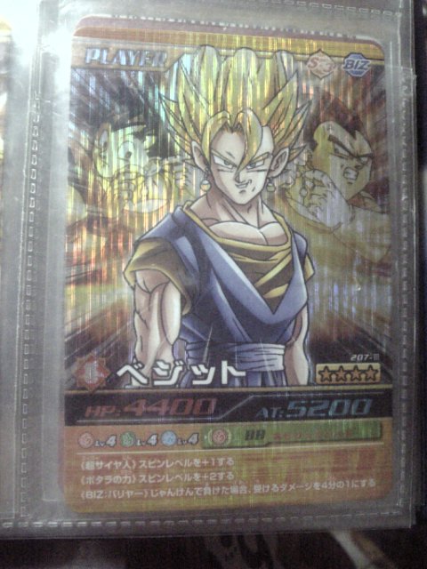 昨日のヤフオクを見ていたら、もう爆裂の5弾のフライング出品が…しかも激のベジット、爆のゴジータ、シークレットのベジータどれもかっこ良い!爆裂は2弾からちょびちょびしか、していなかったんですがこれは引かれるものがありますね。あと気になるのが「魔術」なるアシストカード。自分と相手のアタックレベルを入れ替えるとか…これはZ2の時の「経験の差」のときのような、大会でのデッキの読み合いを一気にヒートアップさせるようなカードですね。レアリティも金レアなんで出易いのかな?ということで会社帰りに少しやってきました。結果はこのスペックは4弾のシクレと同じかな?これ以外には「最長老」が2枚という感じでした。ゴジもベジも出なかったけど、かっこいいベジットがてに入ってとりあえず満足です。でも明日の大会はムシと恐竜とかぶっているし、どちらに行くか悩むなあ。