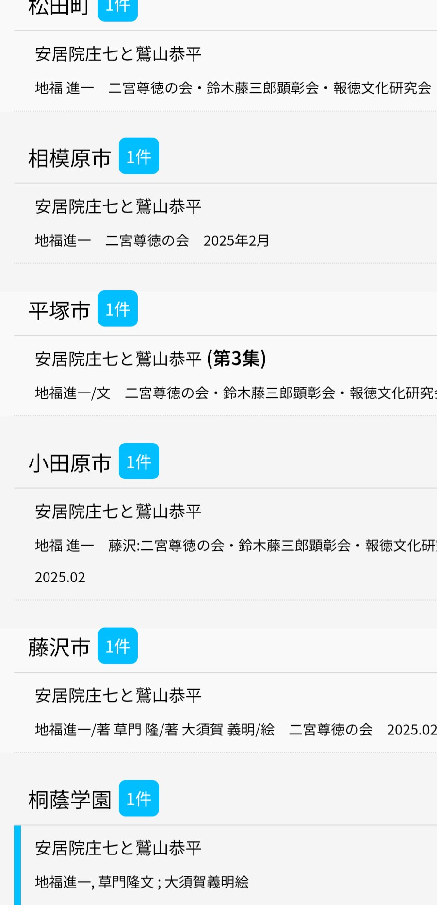 神奈川県立図書館と福島県立図書館に『安居院庄七と鷲山恭平』が蔵書となった。福島県、栃木県、東京都、神奈川県、富山県立、大阪府立、長崎県立図書館の7都道府県立図書館の蔵書となった。一方、青森県、三重県、奈良県、広島県、福岡県、熊本県の6県立図書館で「蔵書とできません」と返却されてきた(返却用レターパックを送って、でも循環し活用できてよかった)。福島県立図書館の本会出版図書の所蔵状況1 安居院庄七と鷲山恭平2 報徳開拓者安居院義道3 資料で読む技師鳥居信平著述集4 シナリオで読む砂糖王鈴木藤三郎の報徳5 二宮先生語録6 八田與一と鳥居信平7 報徳記を読む 第4集8 鈴木藤三郎の『米欧旅行日記』9 報徳記を読む 第3集10 報徳記を読む 第2集11 報徳記を読む 第1集12 二宮尊徳と日本近代産業の先駆者鈴木藤三郎13 鈴木藤三郎