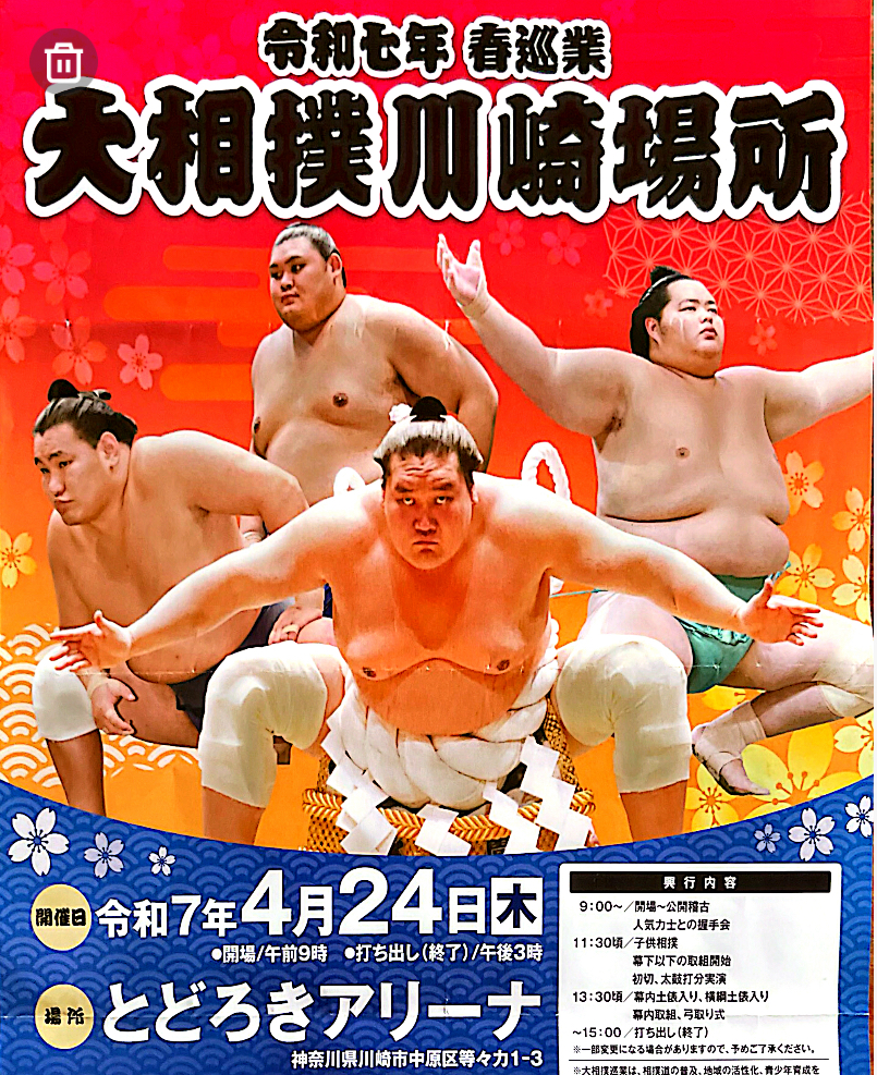 こんにちは!いつも訪問頂き有難うございます。人生で初めての大相撲を観戦してきました。川崎場所は本場所ではないので、真剣勝負ではありません。演舞と言うかなんというか。「観覧」が正解でしょうかね?今回はタダ券をいただいたので、とどろきアリーナに行ってきたのです。このパンフレット作成はおそらく去年だと思われるので横綱がちょっと古い方の写真ですね。アリーナ前には大相撲の旗がたくさん上がっていました。「大相撲がやって来た!」って感じがします。会場到着後は序二段の取組からスタートしました。お相撲さんのカラダの大きさは、上位の力士も下位の力士もあまり変わらないのに驚きです。上位の力士は身体が小さくても強いということは、それだけ才能があるのか、それとも練習量の差なのか?中入に入る前には色々とイベントがありました。相撲甚句というのでは6人が交代で面白い歌を歌うのですがみんなめちゃくちゃ上手です!よくお正月の特番でお相撲さんが歌を歌うと凄く上手なのが納得ですね。土俵入ではデカいカラダのお相撲さんが土俵の上に大集合するのは圧巻でした。最後に横綱の土俵入りです。横綱は扱いが別格でカッコ良かったです。この後は中入後の取組に突入します。真剣勝負じゃないのは見ていてすぐに分かりますがぶつかり合う音とか、技の切れ味は迫力モンですね!大相撲の観覧、なかなか楽しい一日でした。真剣勝負のぶつかり合いである本場所のほうも、一度は見てみたいものですね!最後まで読んで頂き有難うございます。このブログはにほんブログ村の人気ランキングに参加しています。よろしければポチっとお願いしますね! ↓にほんブログ村にほんブログ村にほんブログ村