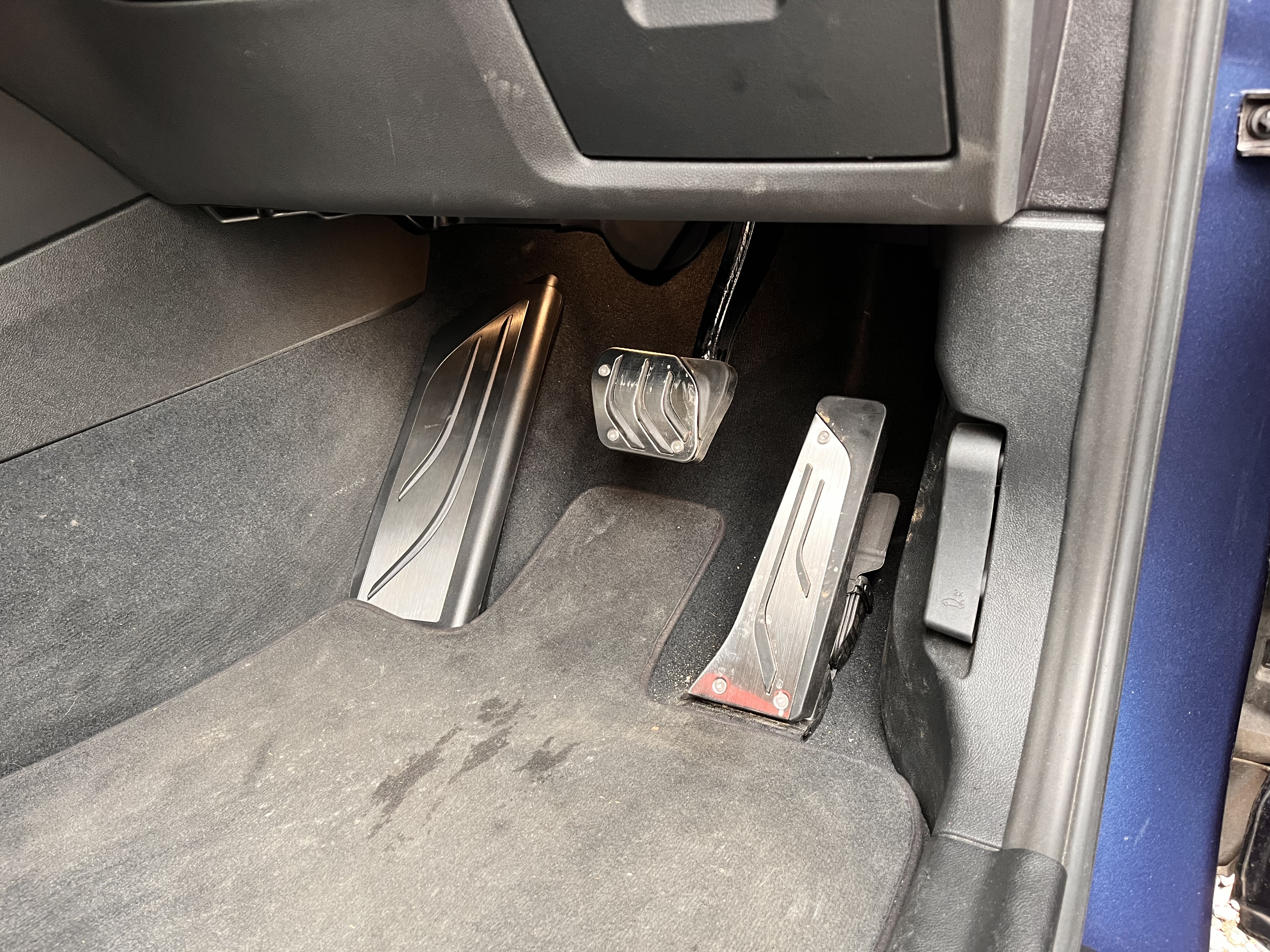 こんにちは!いつも訪問頂き有難うございます。愛車のBMW X3のペダルの話の3回目です。「えっ、まだ終わってないの?」などと言わずに、最後ですのでお付き合いくださいな。前回で、アクセルペダルとブレーキペダルまでが完了しておりました。残すところは、フットレストペダルだけです。フットレストペダルとは、左足を乗せておくだけの、一見、不要なようで、しかし、なければとてもこまるペダルなんですよ。それでAliexpressにこんなのを頼んでいました。この写真の左側です。これなんですけど、1000円ぐらいなので、迷わずポチっておりました。この写真を見た感じでは、あまりにも長方形すぎて、これで大丈夫かなと思いました。でも、一応、年式と型式も合っているので、取りあえず注文したんですな。頼んでから2週間ほどして到着しましたので、合うがどうか試してみました。するとですね、やっぱり合いませんでした。商品が大き過ぎるんですよ。でも、大雨が降り続いていましたので、取付せずに、クルマの中に放置していました。で、色々と考えていたのですが、余計な部分をカットすることにしました。結構分厚い樹脂なのですが、金属板切断用のハサミを持っていたので、うううううううう~えいやぁ~!無事、カットしました。右上と、左下の部分を力技で切断です。では、両面テープで装着してみましょう!じゃん!下に隙間が少しありますが、なかなかのもんでしょう?マットを被せれば、全く問題ありませんよ(笑)これで足元もカッコよく、気にせずに運転できますね!最後まで読んで頂き有難うございます。このブログはにほんブログ村の人気ランキングに参加しています。よろしければポチっとお願いしますね! ↓にほんブログ村にほんブログ村にほんブログ村