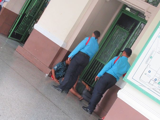 発車前にもう一服と正面玄関前に行くと、 構内警察官に起こされている浮浪者