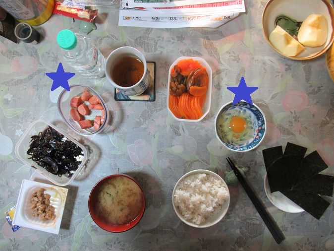 青星の鱈子焼きと生卵は カミさんのご機嫌次第でハムエッグや焼鮭 に替わりやす