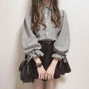 【即納あり】シャツ ブラウス グレー ストライプ柄 ランタンスリーブ ボリューム袖 リボン 七分袖 長袖 カジュアル トップス ダンス 衣装 ヒップホップ コスチューム 韓国ファッション 大きいサイズ 個性的 服 原宿系【お取り寄せ注文可能】