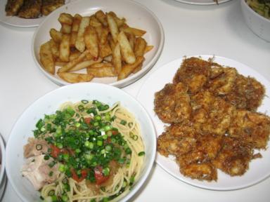毎月恒例の「コンティ会」今回のメニューはこれ! 手前左から「ザーサイラーメン」、「豆腐のカリッと揚げ」、「ジャガイモのマリネ」どれもとっても簡単です!ジャガイモのマリネ、これたぶんビール好きにはたまらないかも~シンプルに塩味も試してみたけど、そして今回のデザート「抹茶のフルーツショートケーキ」 一応私が主に担当。。デコレーションはまーくんにお任せ。う~ん、上手い!! なかなかやるにゃ~上手くできるかしら?・・・・なんて思いながらも、何とか形になりました~今日は初挑戦だったので、レシピ通りにやってみたけどもっとシンプル化できそうな感じ。。また生地だけでも自分でやってみようと思います。美味しいお料理と楽しい会話、またまた賑やかなひと時でした。