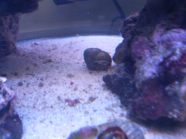 書きます。マスクです。引越し前からウチの水槽にはやドカリがいました。今は殻争奪の結果、10匹程度に落ち着いています。そんな中、喧嘩(捕食?)の結果、足が1本だけ残ったヤドカリが1匹いました。餌はピンセットであげていたんですが、最近になって変化が出てきました。変化というか、 足がとハサミが生えました!「ボク頑張る。」非常に見難いですが、ちっさなハサミとちっさな足が生え水槽内をかけめぐっています。逆に残念なことも・・・・水槽内に3匹カニ(名称不明)がいたんですが、そのうち一匹がお亡くなりに・・・・orz 写真撮り忘れ&なかなか表に出てこないため写真はありませんが、ピンクと赤のまだらな子です。 あとついでに、ライブロックに不明な生き物?がいたので貼っておきます。(生きてるか死んでるかも不明)どんな情報でも良いので教えてください。その1(何かの珊瑚?触っても何の反応も無し。) その2(まったく不明。一応触ると縮む。) よろしくお願いします。
