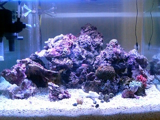 掲示板とコメントの書き込みがあってビックリしました。マスクです。突然ですが、珊瑚の調子が1つだけ悪くなりました。BeforeNowまぁ、Beforeのほうでもなんか開き方が変な感じはしますがここ数日今までみたいに広がっていません。何か変なの入れたっけなぁ・・・ 【珊瑚紹介】一応固体毎に紹介しておきます。トサカ現在調子悪いけど、このほうが色は綺麗かも・・マメスナギンチャクこいつはライブロックを侵食していた為、引越しのときに一番苦労しました。スターポリプ蛍光緑が綺麗。親の水槽ではポリプが開かなかったので略奪した物ディスクコーラル1割ほど大きくなった気がするクダサンゴ最近ようやくまともに出始めた以上が購入や親から株分けしてもらった珊瑚ですがライブロックについてきたものもあります。ウミキノコ?(本当は何?)来たときは半分程度の大きさだったはずケヤリ(多分。。)引越し前にライブロックについていたのを発見カニ(種類不明:2匹)本来は3匹。1匹は原因不明の御亡くなりに・・・他の生体として・ハタタテハゼ 1匹・アケボノハゼ 1匹・スベスベサンゴヤドカリ 10匹・ヤドカリ(名称不明) 1匹・ハナサキタカラガイ(だったかな?) 3匹・シッタカ貝 1匹オーバーフローに移行が完了したらもっと生体を増やそうと思っています。