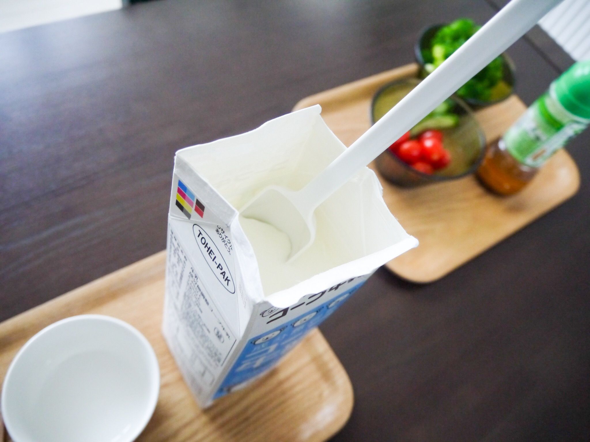 ヨーグルトが少なくなって牛乳パックの上をカットした後も
