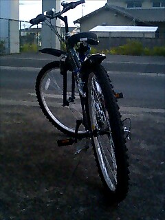 実家の近所の方にマウンテンバイクを譲っていただきました。マウンテンバイクといっても、MTBルックってやつです。当然、荒地走行禁止、一般道路用です。でも、18段変速付きで、ちょっとは楽になるかも。写真のアングルが変ですが、あまりはっきり見せると、安物バレバレだからです。通勤用に、ホームセンターで買ったらしいのですが、あまり使わないまま転勤になってしまい、ガレージにしまってあったらしく、結構きれいです。タダであげると言ってくれてたのですが、綺麗だったので、5000円だけお支払いしました。明日、デビューします。