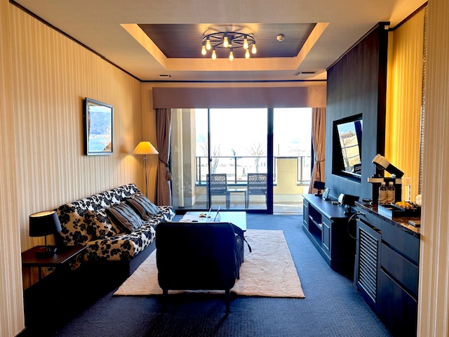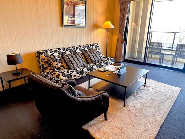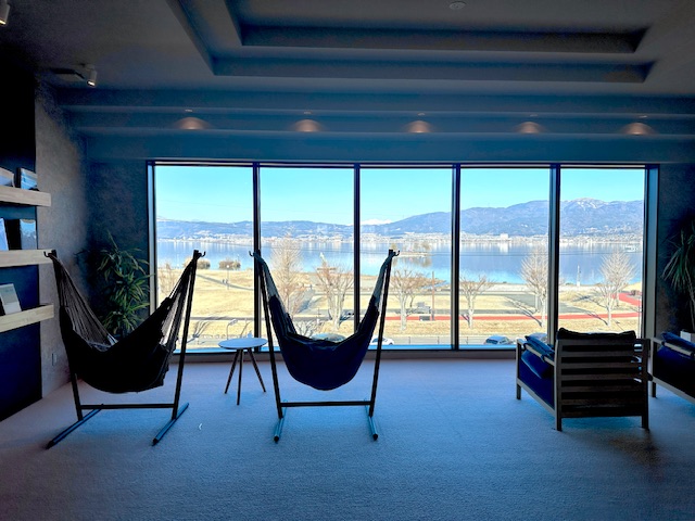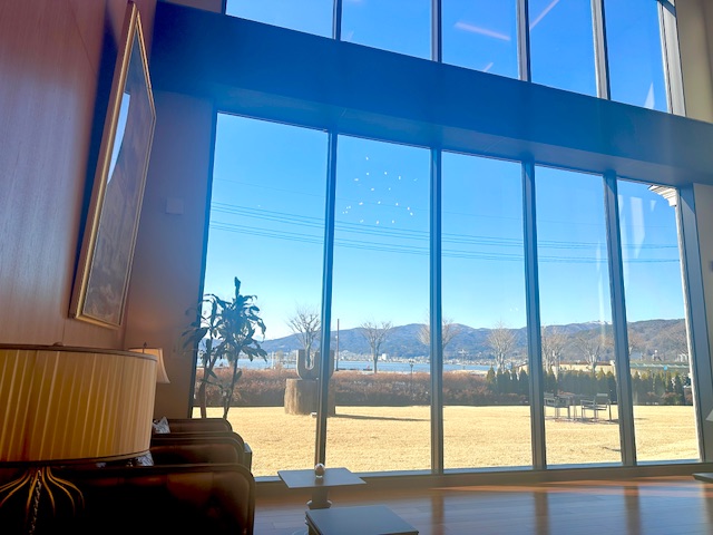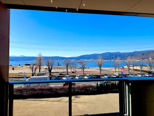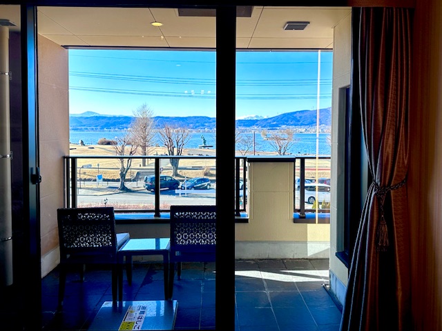 諏訪湖と山々を存分に楽しめる大きな窓。