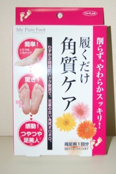 先週の金曜日、とうとうこちらを買いました。【履くだけ角質ケア】 My Pure Foot削らず、やわらかスッキリ!両足用1回分 対応サイズ:26cmまでわずか2時間のパック使用で、足裏の古い角質ポロポロ。ということでして、前々からちょっと気になっておりました。*金曜日の夜、さっそくチャレンジ。液がけっこう垂れてきて、(わわ)とか思いながら装着。セロハンテープで密封(念のためグルグル巻きにしたのでちょっと痛い・・・)。私はさらにその上からビニール袋をかぶせ、足首辺りを輪ゴムで固定。パジャマで失礼いたします。いや~冷えますなぁ・・・ただでさえ末端が冷えるというのに、このような液に2時間・・・冬場にやるのはちょっとつらいかも・・・私の場合。*じっとしていたかったのですが、なんだかんだでやることがあり装着したまま動き回ってしまいました。(ちゃんと効いたかなぁ・・・。)* 私は、これをやったらすぐにでも角質が取れるのかと思っていましたが、違いました。使用後、約5~7日で古い角質がはがれはじめる、ということです。その後、約2~3週間の経過で足裏全体の古い角質がはがれ落ちるそうです。(けっこう長丁場ですね。)現在、3日経過したところです。足裏に特に変化はありません。(まだかなーまだかなー?)はがれるときが楽しみです・・・* 【レビューを書いて爪磨きプレゼント♪】わずか2時間のパック使用で足裏の古い角質ポロポロ♪プ...価格:650円(税込、送料別)YOUR SHOP 楽天市場店* わずか2時間のパックで、つやつや足美人履くだけ角質ケア My Pure Foot (マイピュアフット)価格:699円(税込、送料別)ドラッグ フロンティア*