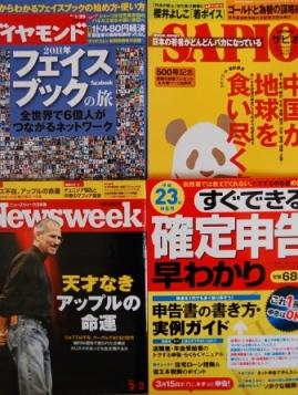 27日52年ぶり爆発的噴火の新燃岳、2度目の爆発。 * 私は【確定申告】のことについてあまりよく知らないので、こんな雑誌を買ってみました。ついでにこれらの雑誌も買ってしまいました。 会社に所属していた時は、総務の方たちが管理してくださりましたし、自分でやるようになってからは、いつも片手間に慌ててやっていたので、毎度、内容が薄っすらとしか思い出せない(苦笑)【年末調整】や【確定申告】。そんなんだから毎年ギリギリバタバタ大変でした。そのようなわけで時間のできた今回はちょっと何か読んでみようかと。 ■学研MOOK 平成23年申告用 すぐできる!確定申告 早わかり 【監修】星野 誠(公認会計士・税理士) 市口恭司(公認会計士・税理士) 申告書の書き方・実例ガイド これ1冊で申告OK! パッと見、これは分かりやすそうだ~♪ということで購入。実際見やすいですし、分かりやすいです。確定申告書は一旦、国税庁のHPに入力して確認しているので(去年も言っていたような気がしますが・・・今年こそはe-Tax申請するぞー・・・)それはいいとして、その他何か知らない情報がないかなぁ・・・と思い。(かといってごちゃごちゃギッシリ書いてあると私はダメなので。こちらを選びました。)なるほど!と思うこともいくつかありました。手軽にサクッといきたい場合や、文字がビッシリはちょっと・・・という私のような者にはちょうどよいボリュームでした。 *昨年の引越し時のことですが、パートナーの診療代(けっこうな額)の領収書がビニール袋に包まれゴソッと出てきたのですが、もう計上できないと思い(悔しかったですが!)シュレッダーにかけたのでした。それが今悔やまれます・・・。ふぅ *それから、表紙の文言に惹かれ購入したもの。■週刊ダイヤモンド 2011年 フェイスブックの旅 全世界で6億人がつながるネットワーク■SAPIO 中国が地球を食い尽くす■Newsweek日本版 天才なきアップルの命運* 【送料無料】すぐできる!確定申告早わかり(平成23年申告用)価格:680円(税込、送料別) 【送料無料】SAPIO (サピオ) 2011年 2/16号 [雑誌]価格:550円(税込、送料別) 【送料無料】Newsweek (ニューズウィーク日本版) 2011年 2/2号 [雑誌]価格:450円(税込、送料別) 楽天ブックス* 【送料290円 2900円以上で送料無料】【平日即日発送】ダイヤモンド社/週刊ダイヤモンド 2011年1...価格:690円(税込、送料別)ココデカウ
