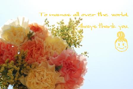 今年はじっくり楽天市場で選ぶ時間がなかったので、本日近所のお花屋さんへ猪突猛進(笑)。2件目のお店さんにて手を打ちました。 今年のニコ&モコのセレクトは、レモンイエロー、淡いオレンジ、薄めの色のサーモンピンク、白い小さなつぼみのついた草花で小ぶりのブーケを作ってもらいました。この感じで約3,000円也~♪ * 私は植物のこと全然知りませんが、お花屋さんで物色するのは大好きです。さすがの私もカーネーションはパッと見分かります(笑)。しかし、最近は紫色のカーネーションまであるんですね~。ヘー。ほー。エンジ色で小さな花弁がモッサモッサとついているお花(悲しいことに花の名前が覚えられない・・・)などと深くて暗い色ばかり集めて・・・ゴスロリファッションの方が持ったら似合いそうな・・・そんな意外性ありインパクトありみたいな花束も作ってみたいです。 などなど考えながら今回のブーケは淡くてヒラヒラ、心が軽く、優しい気持ちになるような?イメージでお花をチョイスしました。 *過去の日記から・・・わ、今年もギリギリ【母の日】昨年もギリギリとか言っていたんですね・・・ハハ昨年は、白い三輪車にプリザーブドフラワーの赤いカーネーションが乗ったものをチョイスしたのでしたっけ。 *そしてカーネーションと言ったら、やはり何と言っても赤。一輪だけ赤も頂きました。 *To mamas all over the worldAlways thank you This year ...The present on Mother's Day : this small bouquet. With the carnation of subtle colors. It is softly light as the image. angelically・・・like princess・・・If feelings of the person who sees lighten even a little, I am glad. Flower shop also had a purple carnation. I went after a long time to flower shop. I do not know the plant so much. However, it is happy to do various images according to shape and the color of the flower. A standard, red carnation was bought. Only one. *I love 日本 ○ Toward new Japan●With the world ☆For the future♪