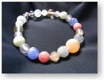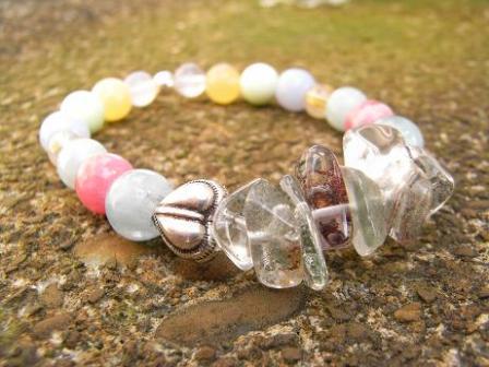 ちょっと石の波動を感じてみたいって思うなら、こんなブレスレットはいかがですか?キュートなカラーから『Le bonbon du bebe』(赤ちゃんのキャンディ)と名づけました。中央の石から、アゲート、アクアマリン、ルチルクォーツ、インカローズ、カイヤナイト、ピンクカルセドニー、レモンクリソプレイズ、ラベンダーアメジスト、シトリン、ブルーレース、アクアマリン、水晶となんと11種類の天然石をチョイスしました。よくばりな選び方をしたようですが、よくばりではなく“贅沢”と言ってください。この際ですから、石の意味や願いは二の次。あれもこれも一緒にしたい!好きな石ばかりをいっぺんに身に付けたい!こんなわがままだけを叶えてみました。 意外とかわいいと思いませんか?そして、意外にもとっても不思議な波動を感じる組み合わせになりました。「こんないっぱい色を並べたら、石たちがケンカしちゃわない?」そんな心配はしなくても大丈夫。私たちが思うより、石たちはお互いを想い合っているようです。お隣に合わせながら、お互いがお互いを高めあう。少しお疲れモードのとき、少し感覚が研ぎ澄まされて石から気づくことがあります。そして、石の波動が伝わります。石の声を聴いてみたくなったら、お好きな石だけを選んで こんな組み合わせをしてみませんか?