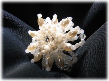 久しぶりにビーズリングのご注文を頂き、ビーズワークをしました。『Snowy fairy』(雪の妖精)です。白いビーズでお花の中指用リングを・・・というご注文でした。久しぶりのビーズワーク、とりあえず白いビーズを集め、イメージを膨らませました。中央に輝くラインストーン、その周りにはオフホワイトのシード。ナツメパールで高さを出し、外側にはスワロフスキーを添えて華やかさをプラスしました。ホワイトのグラデーションが清楚なイメージの彼女にぴったり。どんなシチュエーションで身に着けていただけるのか、今からとっても楽しみです。