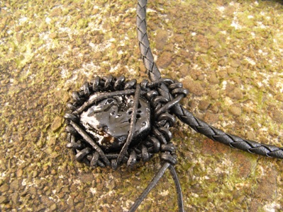 テクタイトのタンブルを皮ひもで巻いてみました。『Espacio(宇宙)』と名づけました。テクタイトは宇宙由来の石。石といってもその成分はガラスでできています。テクタイトは隕石が地球に衝突したときにできた自然のガラスと言われていますが、その実態は未だに解明されていないようです。なぜならば、生成過程のどこかで大気を高速で通過した跡があるようなのです。どういうかたちにせよ、一度大気圏を出て、地球に戻ってきたような形跡が見られる不思議な石なのです。ガラスというには忍びないほど、エネルギーを感じます。両手いっぱいのテクタイトを持つと、ちょっと手がふわ~っと痛くなるような不思議な感覚に襲われます。ちょっとハードなイメージで、美しいというには程遠い風貌なので、皮ひもでデコレーション。いつもと違った雰囲気に仕上がりました。不思議な生い立ちを持つテクタイト。日の光に透かせると、ほんのりとブラウンに光を通します。
