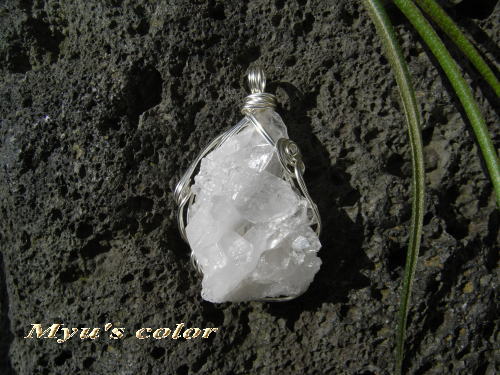 小さな水晶クラスターをワイヤーでドレスUP。 『A snow bad~雪のつぼみ』と名づけました。 透明な結晶が寄り添うようにならぶその姿が、お花のつぼみのように可憐・・・ そして、見る角度によってはレインボーも浮かび上がります。 水晶クラスターは浄化作用があり、自分も、また、その周囲までもの有害なエネルギーを取り去り、美しいエネルギーで満たします。 大きなクラスターを持ち歩くのは無理でも、こんなコンパクトなクラスターならペンダントトップとして持ち歩けます。 私たちは、ふとした瞬間にサイキックアタック(無意識、意識的にかかわらず他人に対する良くない思考や感情を向けてしまうこと)を受けてしまうことがあります。 それがたとえ無意識だったとしても、受けた人には多少なりともダメージがあるはず・・・ もし、そのダメージを感じているのなら、ぜひ、身につけてみることをお勧めします。 これってもしかして、お守りっぽい? いえ、お守り以上かもしれません。 そのサイキックアタックさえもキレイなものに浄化して、跳ね除けます。 あなたの周りが美しいパワーで満たされて、癒されていることを感じて下さい。
