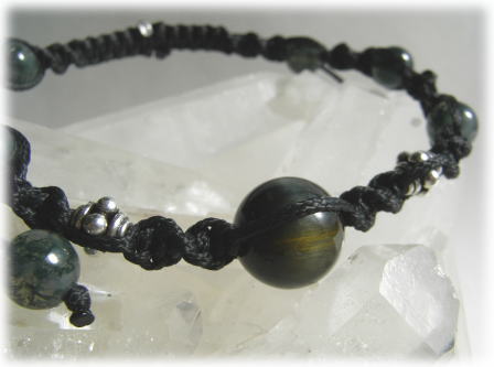 サンダーエッグアゲートをメインに、マクラメ編みブレスレットを仕立てました。『coffret~小箱』と名づけました。サンダーエッグアゲートは龍神の卵と呼ばれるめのうの一種。グラウディングの石なので、地に足が着いた状態、つまり浮き足立たない安定感をもたらします。誠実性を好むこの石は、自分の真実を語るように促します。ネガティブなエネルギーを取り除き、転化させ、オーラを安定させます。そしてサブストーンとして、人気のルチルクォーツを。この石は「金運の石」としても有名ですが、サブストーンとして使うと、メインストーンを助け、更なるパワーUPを促します。サイキックアタック(霊的な邪悪な攻撃)から身を守ることもできますので、お守りとして持つには最適といえるでしょう。今回のお客様は、お友達の紹介の方。私が作ったブレスレットを見てくださり、「ターコイズや、緑色の石を使って・・・」とのご注文だったのですが、なぜか他の石を使いたくなりました。「金運を♪」というお話を聞いた時、真っ先に浮かんだのがこのルチルクォーツ。ルチルを使うんだったら、メインはこれを・・・と、私の勝手な判断だったのですが、組んでみるととてもしっくりと・・・・サンダーエッグアゲートがいい仕事をしてくれました。私の中でのご注文者のイメージが勝手に広がり、緑の石は小さなモスアゲートを忍ばせていただきました。モスアゲートではハートチャクラを開きます。その隙間からルチルクォーツの金色の光を入れてあげてください。『金運UP、満タンです!』って心の中でつぶやいて、潜在意識も巻き込んで金運を引き寄せてしまいましょう。少しハードなイメージに仕上がったこのブレスレット。真ん中のcoffret、小箱の中から枯れることなく湧き出すエネルギー。龍神のパワー、ルチルのパワーであなたのマストアイテムになることを願っています。