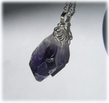 アメジスト原石ポイントでペンデュラムをお仕立ていたしました。『レイライン』と名づけました。この作品は、お友達へのプレゼント。ふじの3339さんです。先日の松竹村開放日に初めてお会いしました。その日の午前中、急に何かプレゼントしたいと思いつき、作らせていただいたのがこのペンデュラム。これしか考えられない!という勢いで、何も考えずに仕上がりました。ふじのさんにお渡ししたところ、「ペンデュラムが欲しくて探していたの!」というお言葉をいただき、こういうつながりなのかな・・・♪ と感じました。アメジストは心に作用する石。その時の心の状況によって、沈静させたり、刺激をあたえたりしてくれます。日常の思考から転換して、心の中を静かに見る時にも有効です。Myu’s colorのペンデュラムはペンダントトップとしてもお使いできるようにしてあります。いつも身につけていただくと、石とのチューニングも自然にできますので、ペンデュラムとして使用する時もなんの障害もなくすんなりと答えを導いてくれることでしょう。自分専用にカスタマイズして、石のパワーを使いこなしてください。 Myu’s color